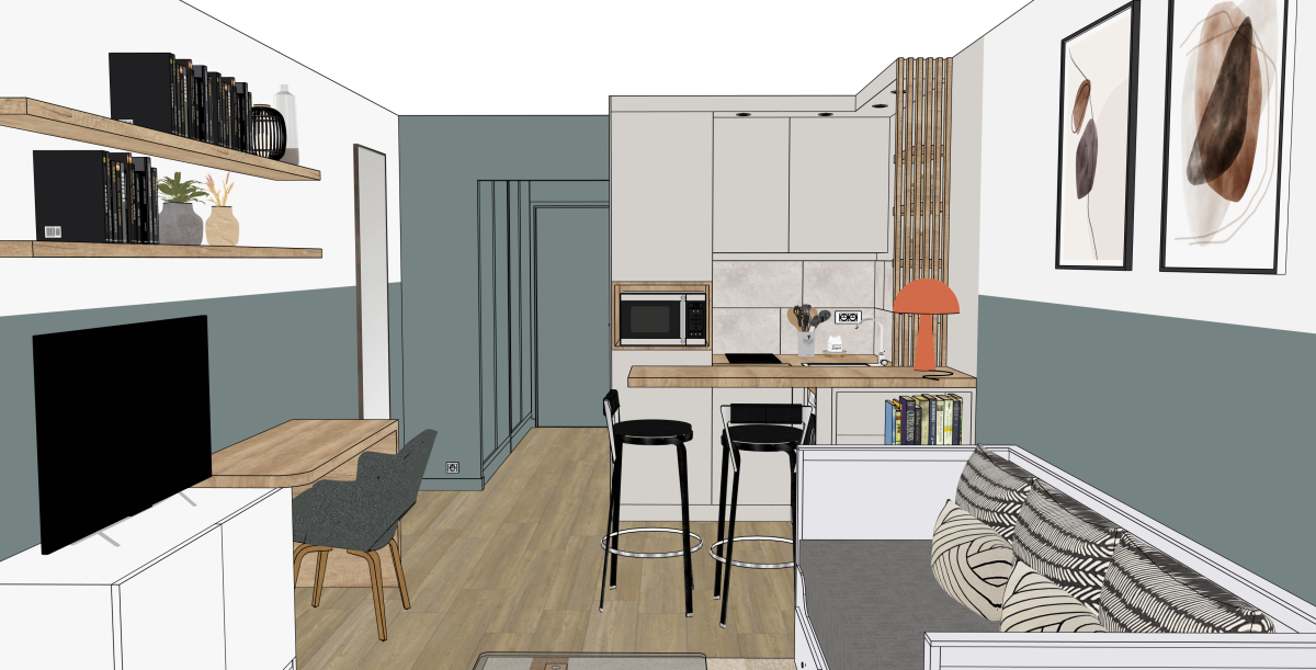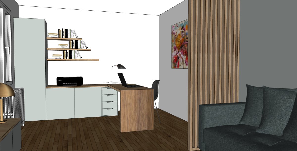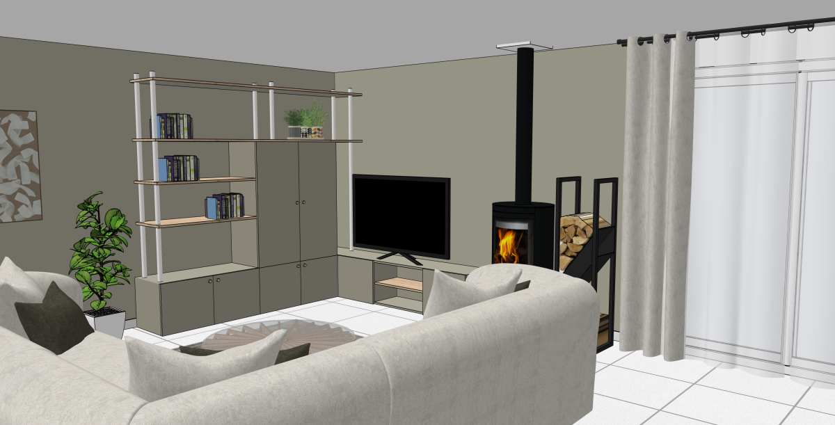Rénovation d'une pièce de vie et d'une cuisine avec la création d'un meuble télévision sur mesure.